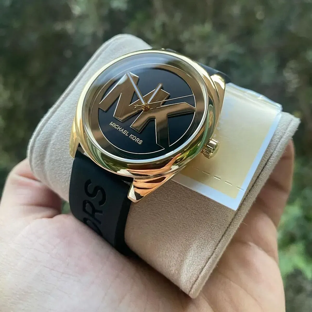 ساعة أنيقة بفخامة لافتة تجمع بين الجرأة والرقي في تفصيلة واحدة. علبة بطلاء ذهبي لامع تمنح المعصم حضوراً قوياً، مع حواف مصقولة تعكس الضوء بنعومة، وتاج جانبي محفور بشعار MK يضيف لمسة توقيع مترفة. الميناء الأسود العميق يحتضن شعار الماركة بحجم كبير بتباين ذهبي واضح، ما يمنح القراءة وضوحاً فورياً ويجعل التصميم قطعة أيقونية تلفت النظر من أول وهلة. عقارب رشيقة بلون ذهبي تتحرك بسلاسة فوق خلفية داكنة، فتجتمع البساطة مع الفخامة في مشهد بصري متوازن.