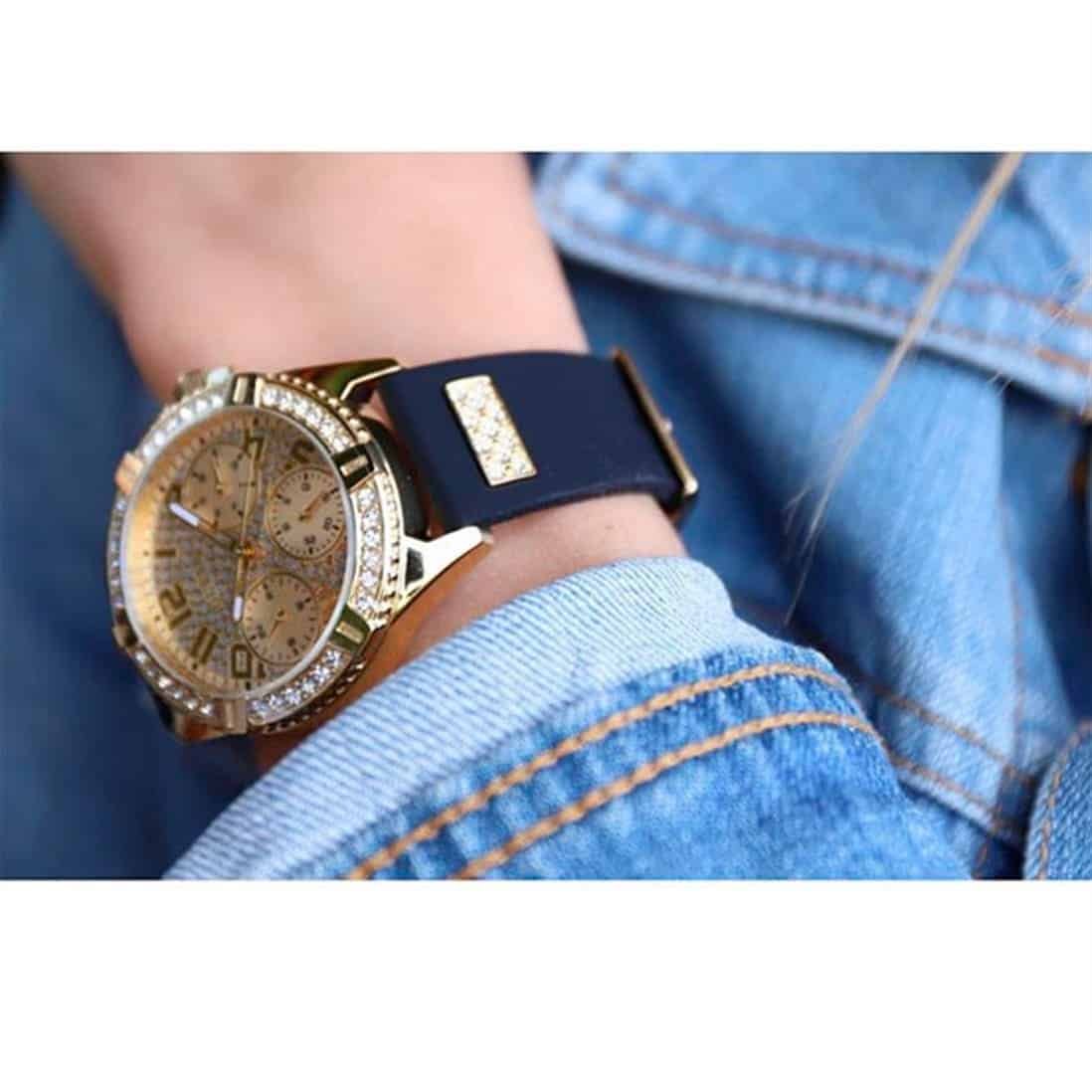 شكل وتفاصيل الساعة: تتميز ساعة Guess نسائي بشكل دائري أنيق بقطر 40 مم وسُمك 12 مم، مما يجعلها مريحة على المعصم، بوزن خفيف يبلغ 99 جرامًا، مع مينا ذهبية فاخرة تضفي لمسة من الرقي.